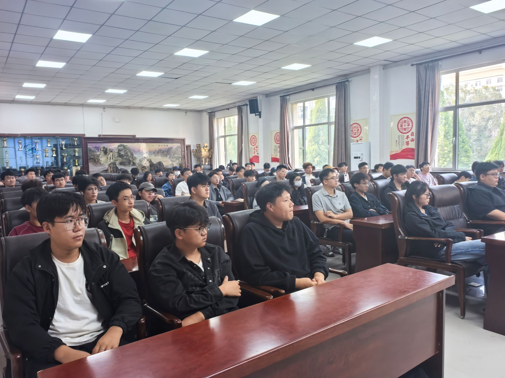 在互动问答环节,现场学生踊跃举手,提出“跨专业求职如何弥补背景差距”“秋招失利后该如何调整心态” 等具体问题。包森布日以自己当年的经历鼓励学生:“求职是‘双向选择’,一次失利不代表能力不足,反而可以复盘总结,把每一次失败转化为‘优化清单’,春招和补录还有很多机会。” 现场掌声阵阵,不少学生拿出笔记本认真记录,或是用手机拍摄 PPT 上的 “求职避坑指南”。